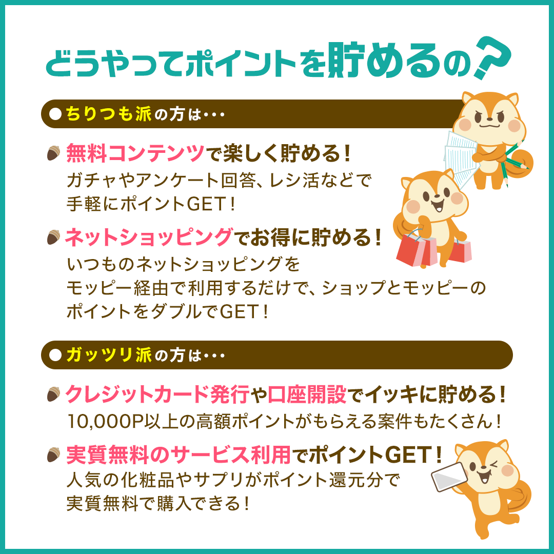 ネットショッピングをする方はモッピーから買い物をすると、モッピーのポイントとショッピングサイトのポイントが両方貯まります。