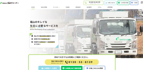 福山市の不用品回収・粗大ゴミ回収・ゴミ屋敷清掃なら生必クリーナー。福山市公認の不用品回収の許可業者です。不用品回収・粗大ゴミの回収・ゴミ屋敷清掃・遺品整理・家庭系一般廃棄物の定期回収などの充実サービス。福山市で不用品回収・粗大ゴミ回収ならお気軽にご相談ください。