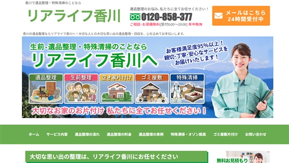 香川で遺品整理ならリアライフ香川に全てお任せ下さい。24時間年中無休で、認定遺品整理士が丁寧に対応させていただきます。出張見積もりは無料、香川県全域に対応しております。どうぞお気軽にお問い合わせ下さい。