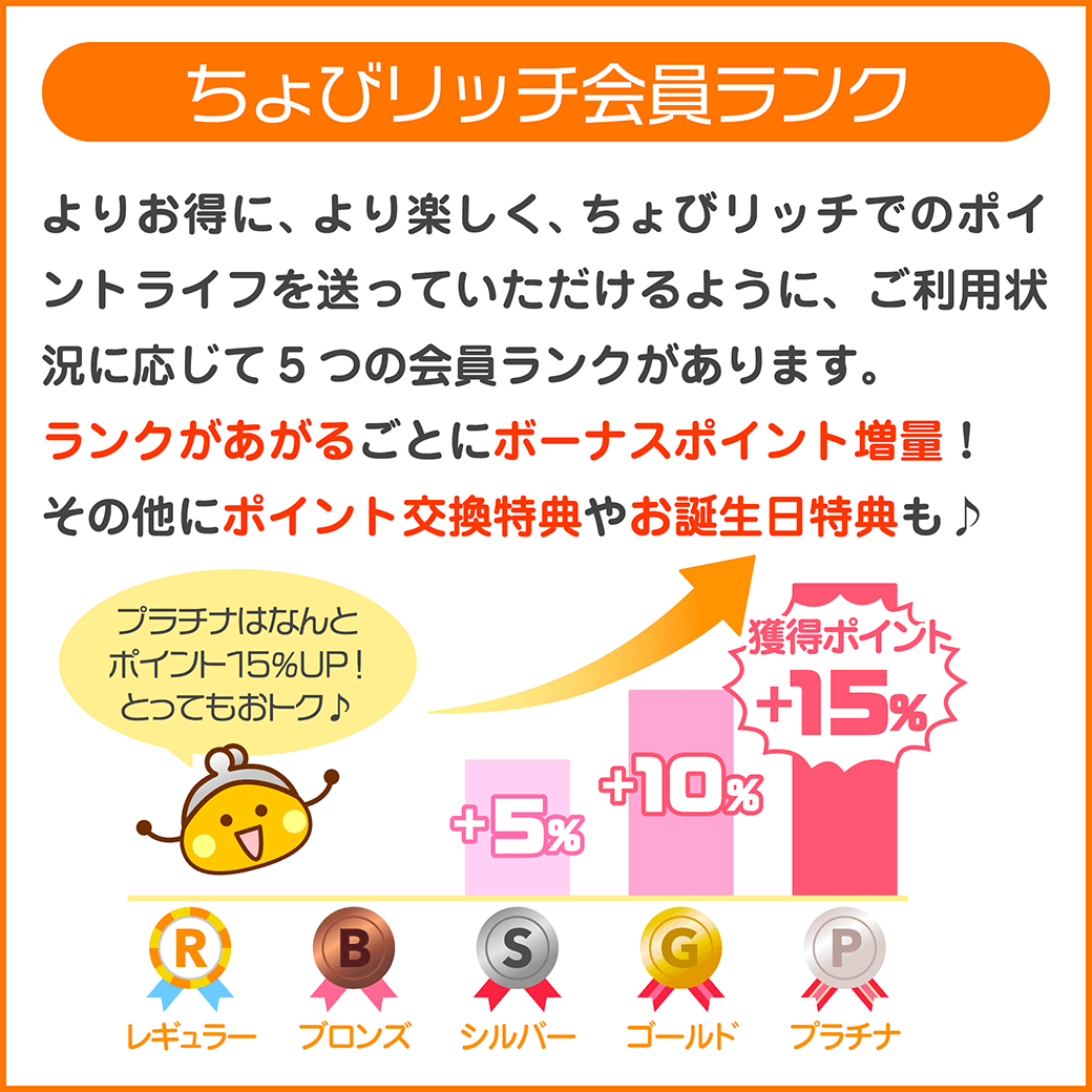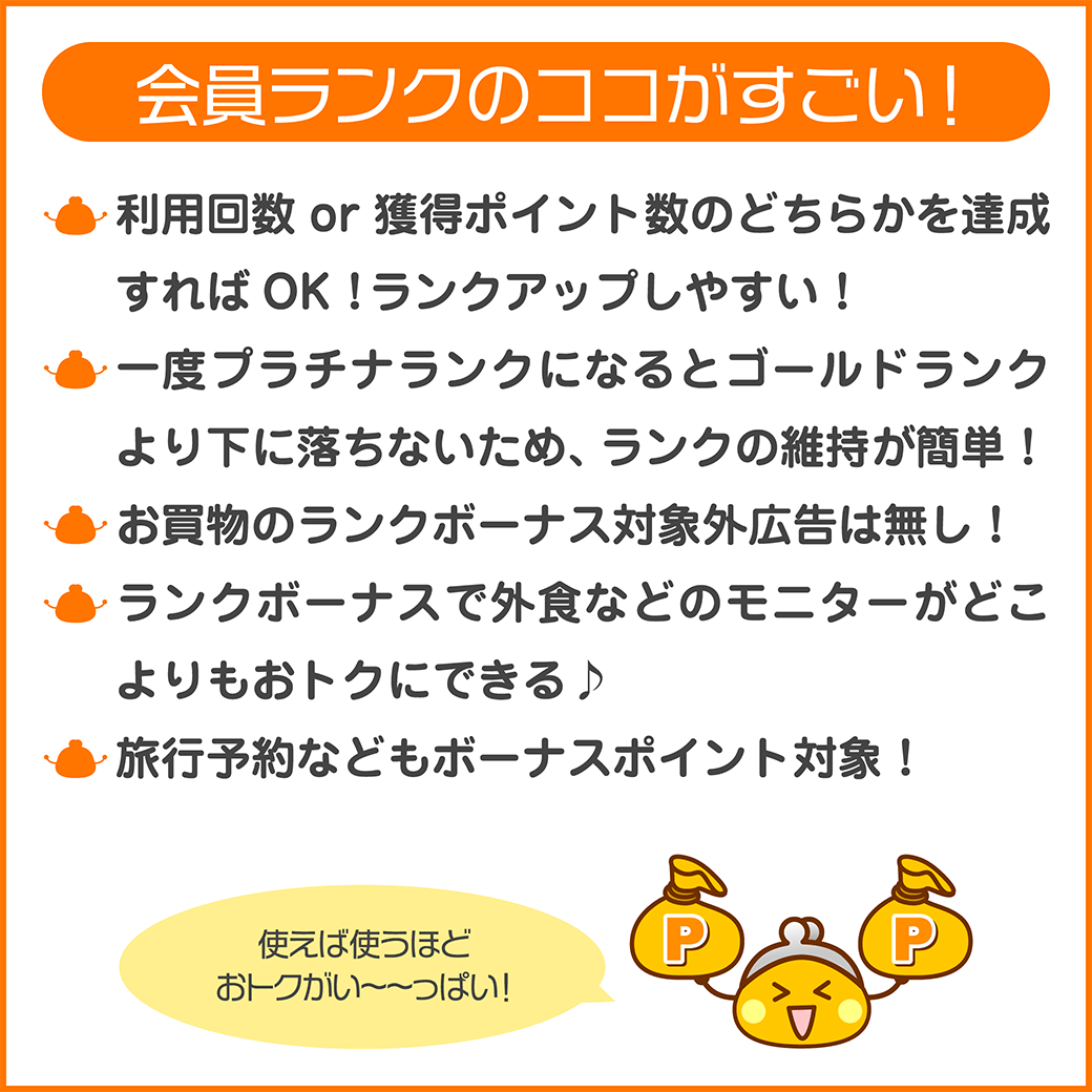 ショッピング等の案件利用回数、または獲得ポイントに応じてランクアップし、サービスを利用するときに還元ポイントに対してボーナスポイントが加算されます。(対象外の広告もあります。)